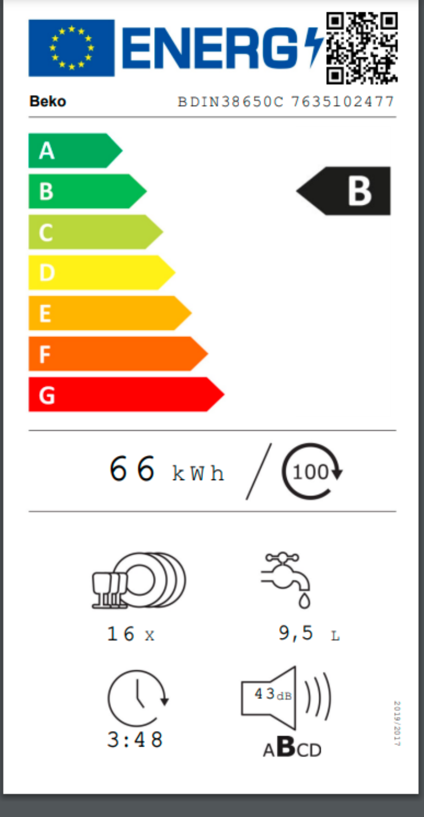 Spotřeba energie na 100 cyklů (kWh): 66