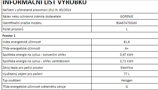 | Objem trouby L | 77 |